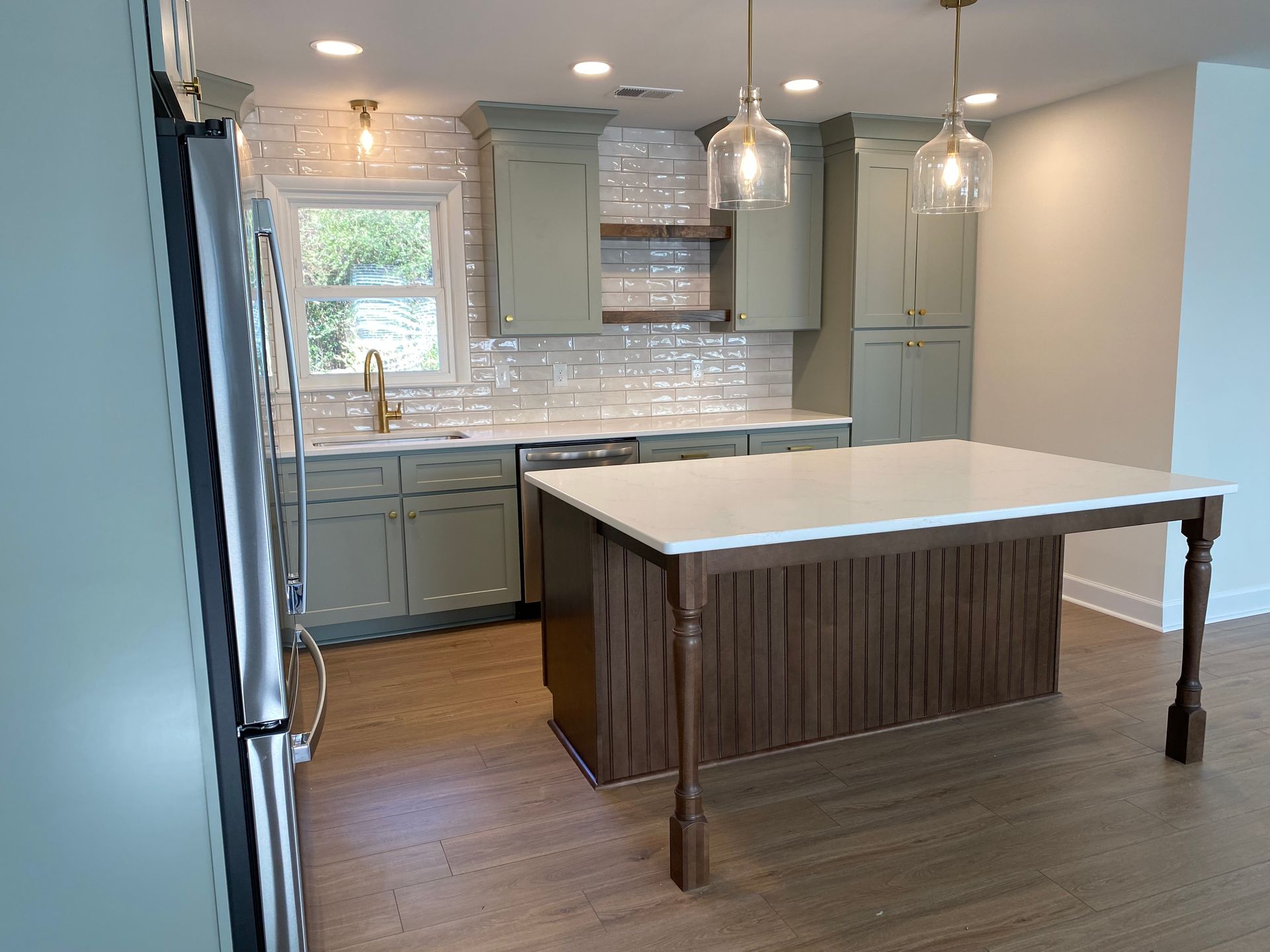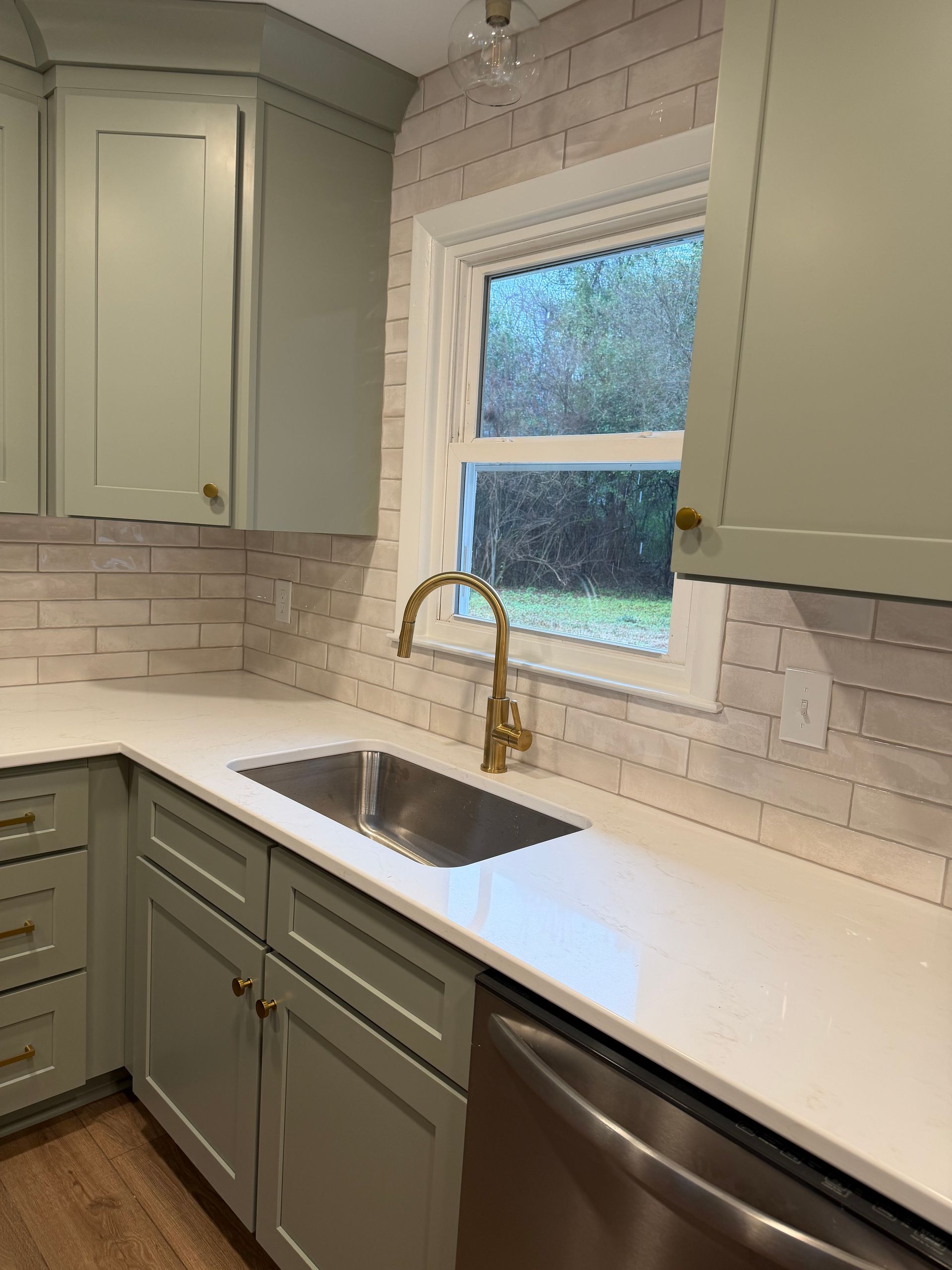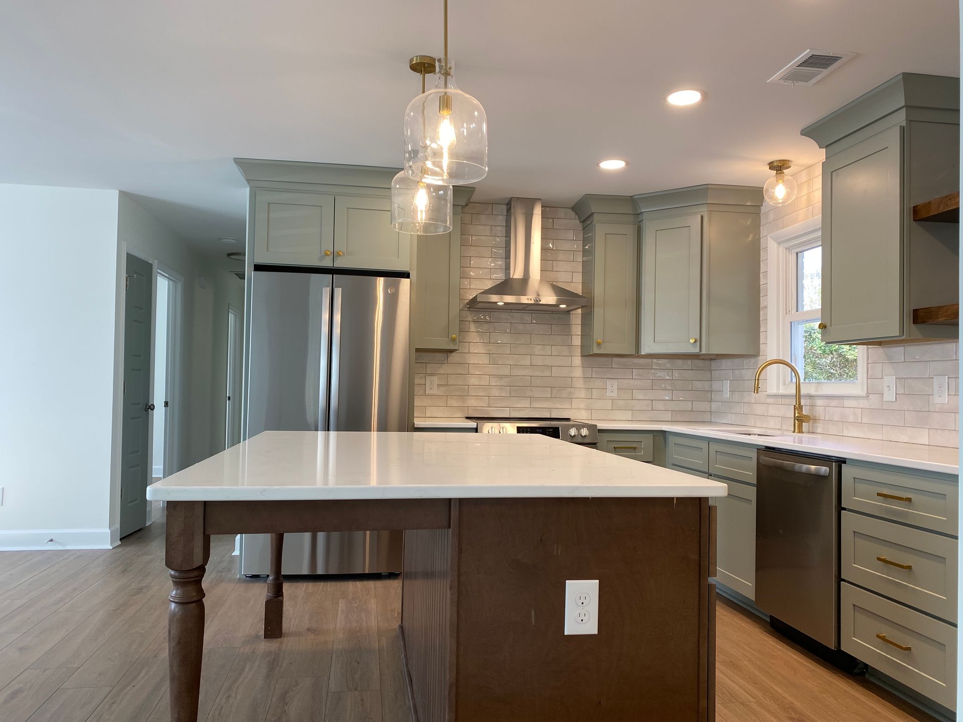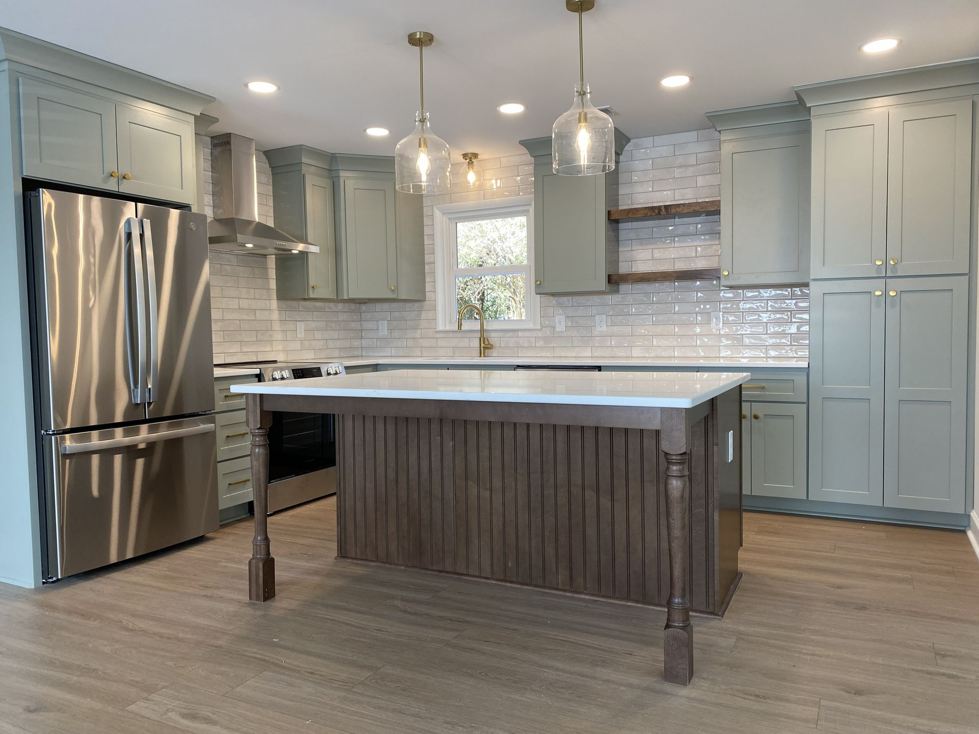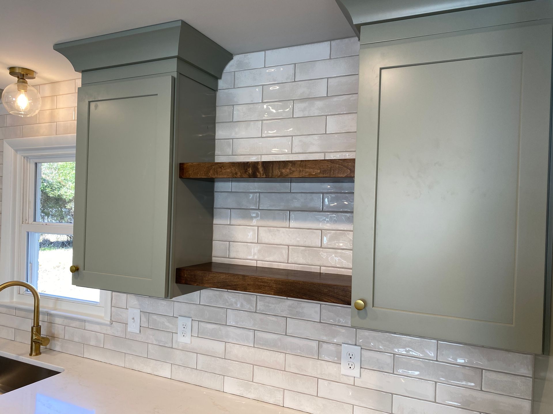 - Sage green shaker cabinetry